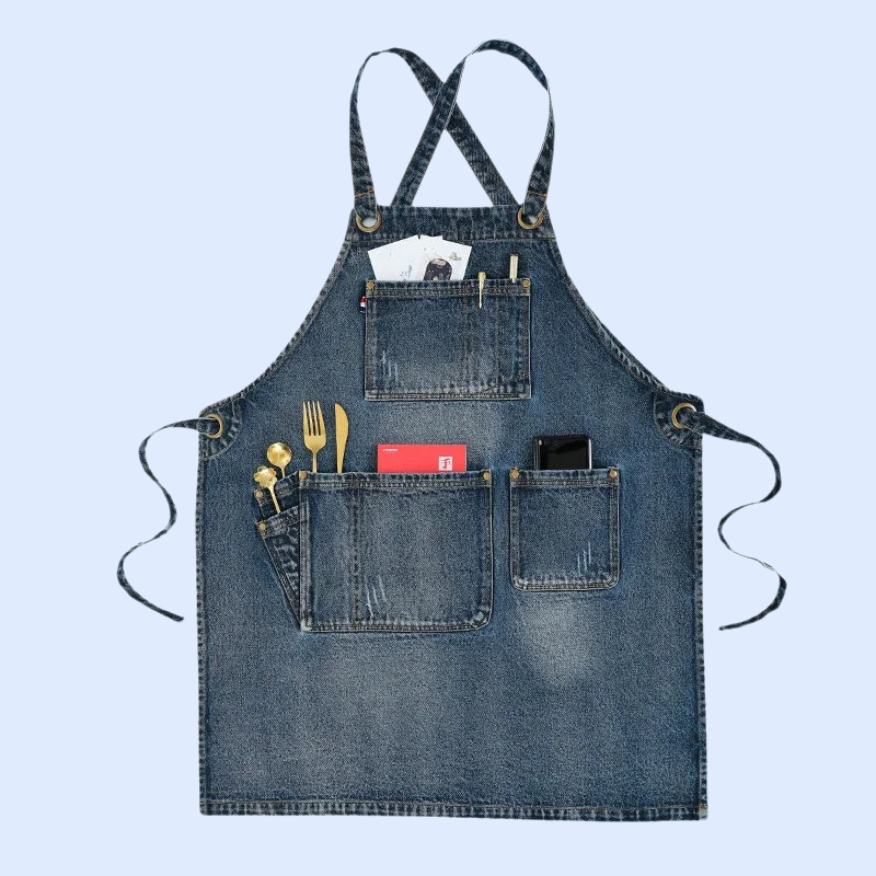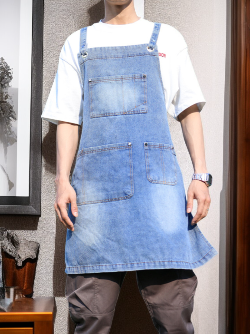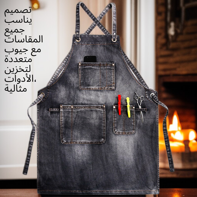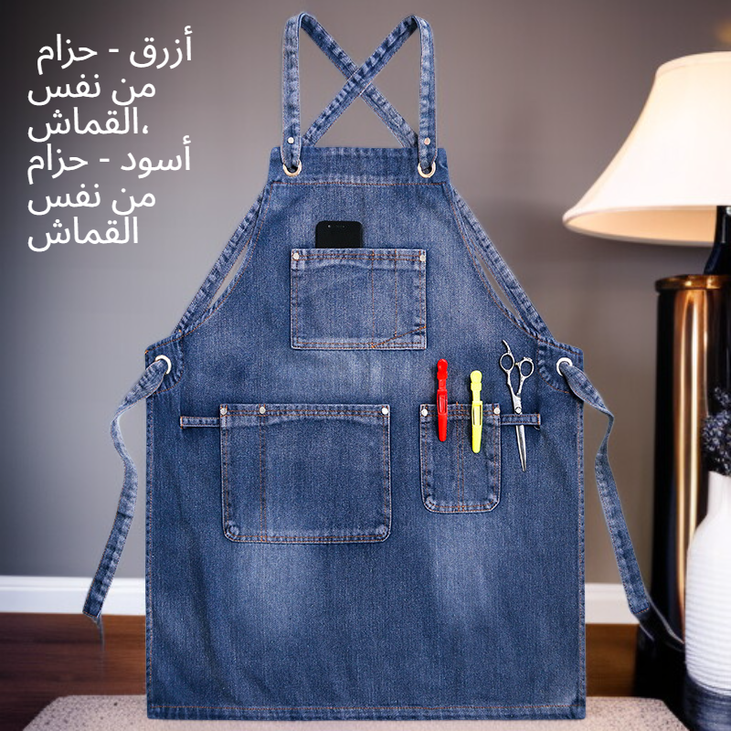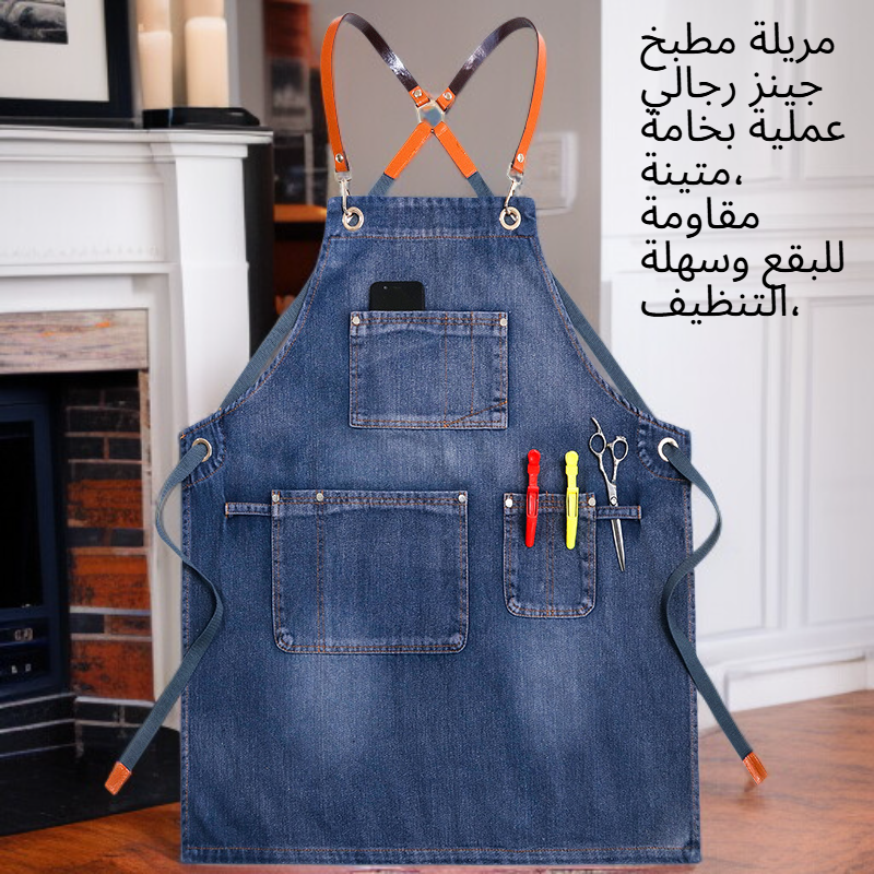 مريلة مطبخ جينز رجالي عملية، مقاومة للبقع، سهلة التنظيف، تصميم أنيق وجيوب متعددة لتسهيل العمل اليومي في المطبخ أو المطعم.